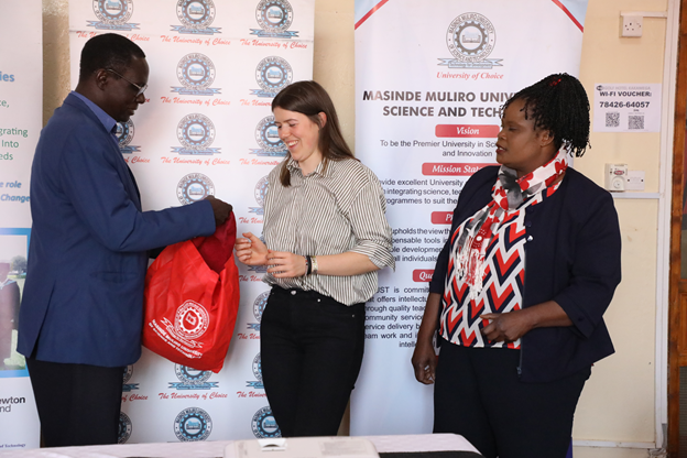 The Dean School of Agriculture, Veterinary Sciences and Technology-Prof. Vitalis Ogemah, presents a gift to Ms. Verena Jauß as Ms. Tabytha Shisia looks on.