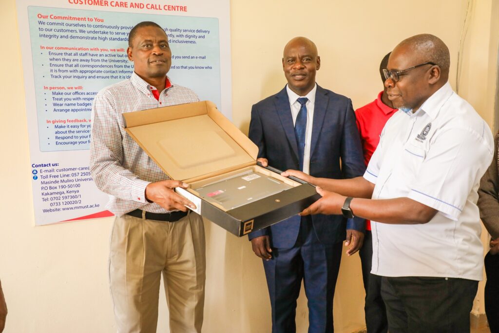 The COD Physics, Dr. Maxwell Mageto receives an equipent from the Dean SONAS-Dr. Joseph Owino.