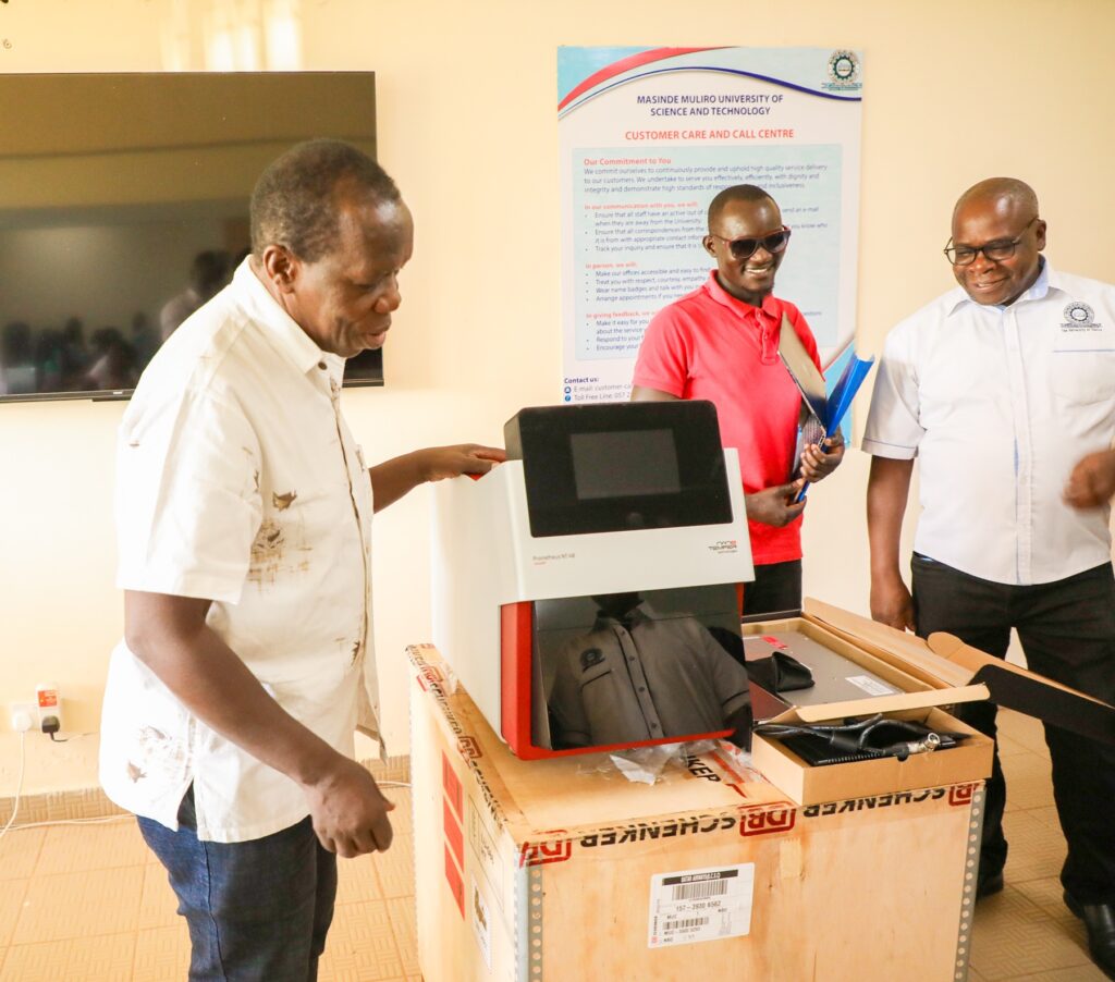 The Vice Chancellor- Prof. Solomon Shibairo receives the Prometheus NT.48 equipment.