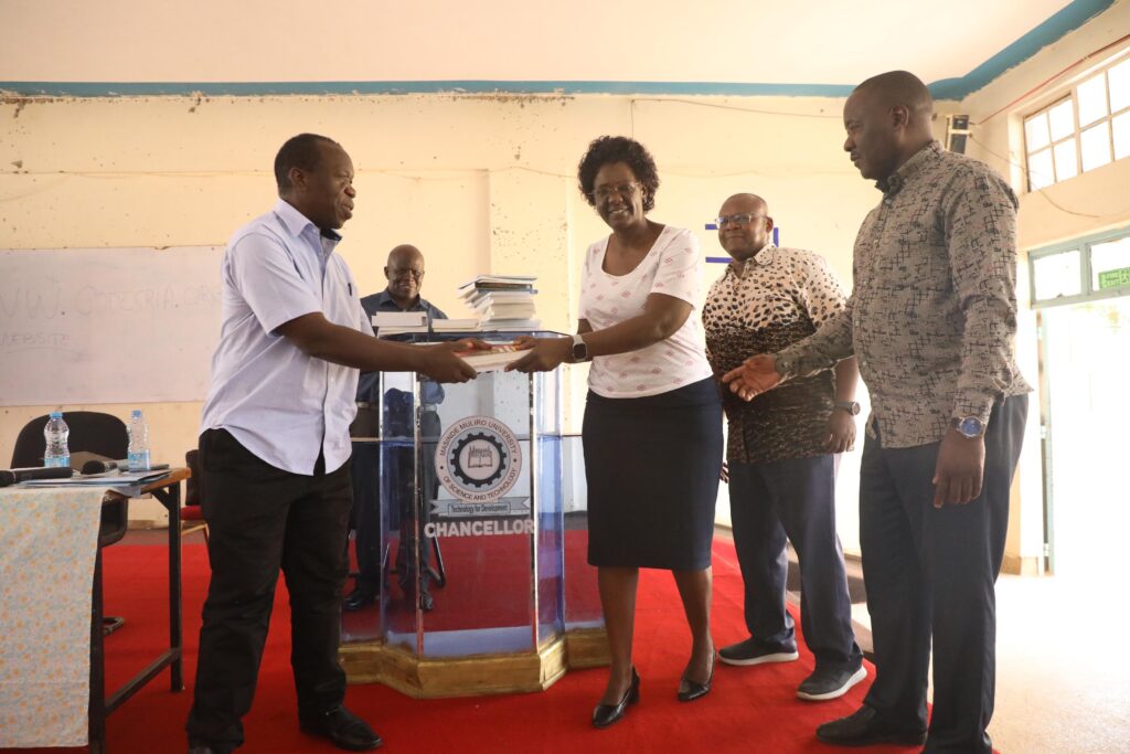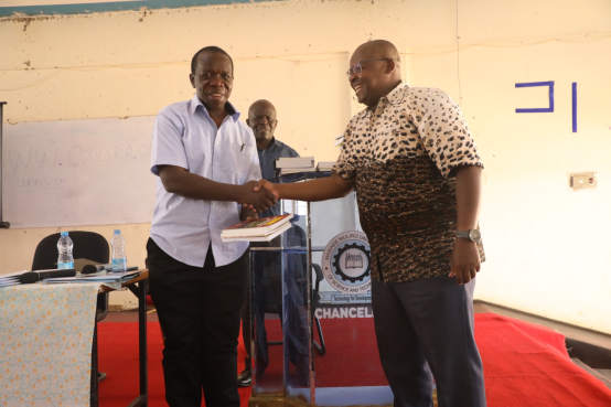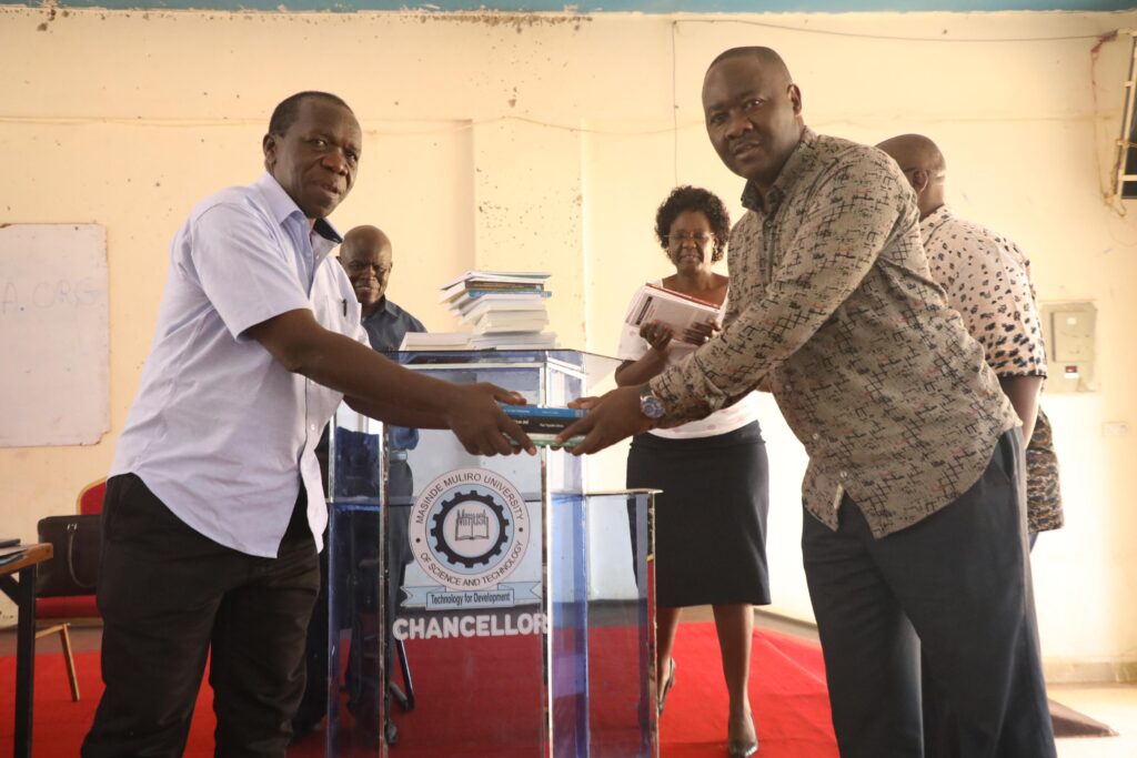 The Vice Chancellor, Prof. Solomon Shibairo receives a donation of books from Dr. Godwin Murunga of CODESRIA.