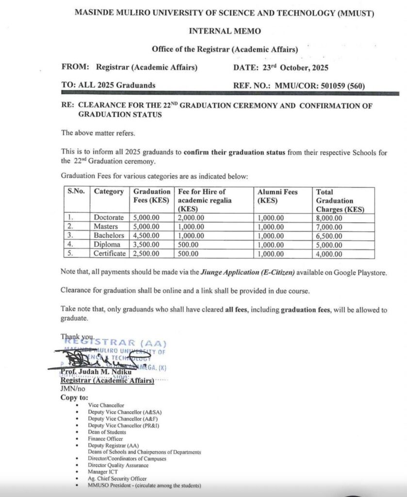 Clearence for the 22nd Graduation Ceremony and Confirmation of Graduation Status Categories Notice Board Date October 23, 2025 Share: MMUST Previous post MMUST Hosts Workshop on Value Creation Education to Advance Tripartite Agreement with Japan’s Soka University and the University of Nairobi October 23, 2025 You may also like The MMUST Password Magazine September 23, 2025 FINAL Semester I (2025/2026) Blended Teaching Timetables September 21, 2025 The official timetables for Semester I (2025/2026 Academic Year) are now available for download. Please use the links below to access your timetable: Call for Proposals: Small Grants Initiative September 12, 2025